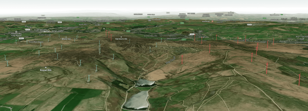 Our interactive 3D visualisation of Scout Moor shows the existing turbines and the positions proposed for the new ones. The visualisation also includes the ability to fly-through the area, along the route of Rooley Moor Road, from Catley Lane up to Waugh’s Well.